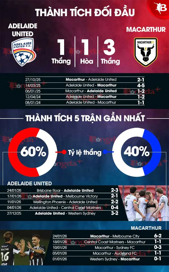 Lịch sử đối đầu cũng đang nghiêng về phía Macarthur khi họ giành chiến thắng trong 4 trên tổng số 6 lần gặp Adelaide United gần đây. Với lối chơi sắc sảo và khả năng kiểm soát trận đấu tốt, Macarthur hoàn toàn có thể rời sân Coopers với ít nhất một điểm.