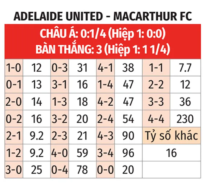 - Lợi thế kèo châu Á: Macarthur đã thắng kèo châu Á trong 7/9 trận gần nhất. Trong các cuộc chạm trán với Adelaide United, họ cũng thắng kèo ở 5/6 lần gần đây, cho thấy đây là lựa chọn đáng tin cậy hơn.