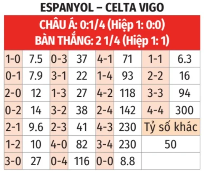 - Hiệp 1 ít bàn thắng: 9/10 lần gặp nhau gần đây giữa hai đội chỉ chứng kiến tối đa 1 bàn thắng trong hiệp 1. Xu hướng này cũng xuất hiện ở 8/9 trận sân nhà gần nhất của Espanyol và 17 trận vừa qua của Celta Vigo.