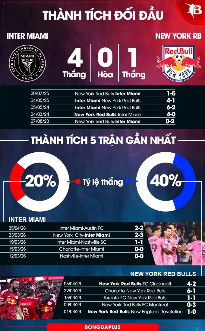 Ở phía bên kia chiến tuyến, New York Red Bulls đang xếp thứ 7 với 10 điểm. Xét về mặt phong độ, lợi thế nghiêng hẳn về phía Inter Miami khi họ đang bất bại trong 8 trận gần nhất. Trong khi đó, New York Red Bulls chỉ có được 4 chiến thắng trong 10 lần ra quân vừa qua.