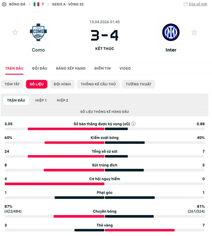Thống kê trận đấu cho thấy một nghịch lý thú vị. Como kiểm soát bóng tới 60%, thực hiện 24 cú dứt điểm (so với 7 của Inter) và có chỉ số xG vượt trội (2.79 so với 0.88). Thế nhưng, sự thiếu quyết đoán trong những tình huống then chốt và những sai lầm phòng ngự đã khiến họ phải trả giá.
