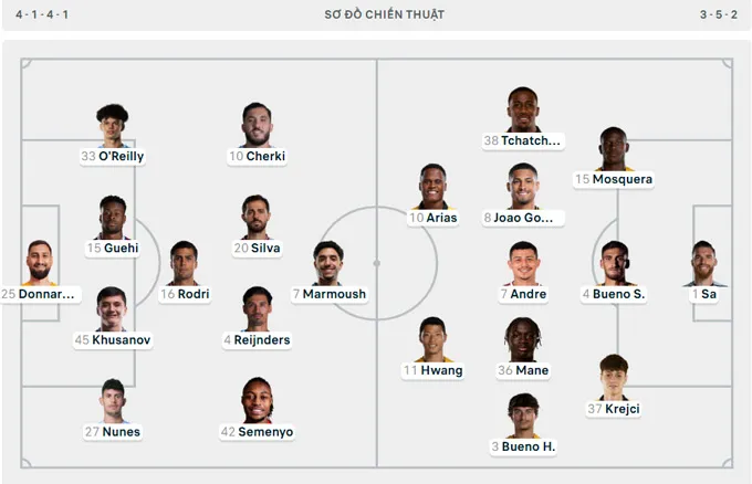 Man City triển khai đội hình với sơ đồ 4-1-4-1. Điều đáng chú ý là siêu sao Erling Haaland chỉ được xếp ngồi dự bị. Vai trò trung phong cắm được giao cho Marmoush. Bộ tứ tiền vệ gồm Cherki, Silva, Reijnders và Semenyo hỗ trợ phía dưới. Ở hàng phòng ngự, trung vệ mới Guehi có màn ra mắt chính thức, đá cặp với Khusanov.