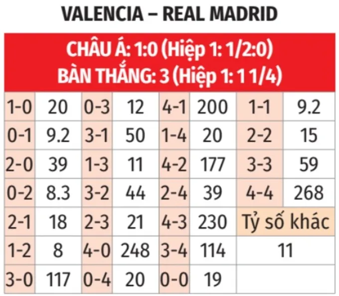 - Tổng bàn thắng chẵn: Xu hướng tổng số bàn thắng là số chẵn xuất hiện ở 5/7 trận sân nhà gần đây của Valencia và 4/5 trận vừa qua của Real Madrid tại La Liga.